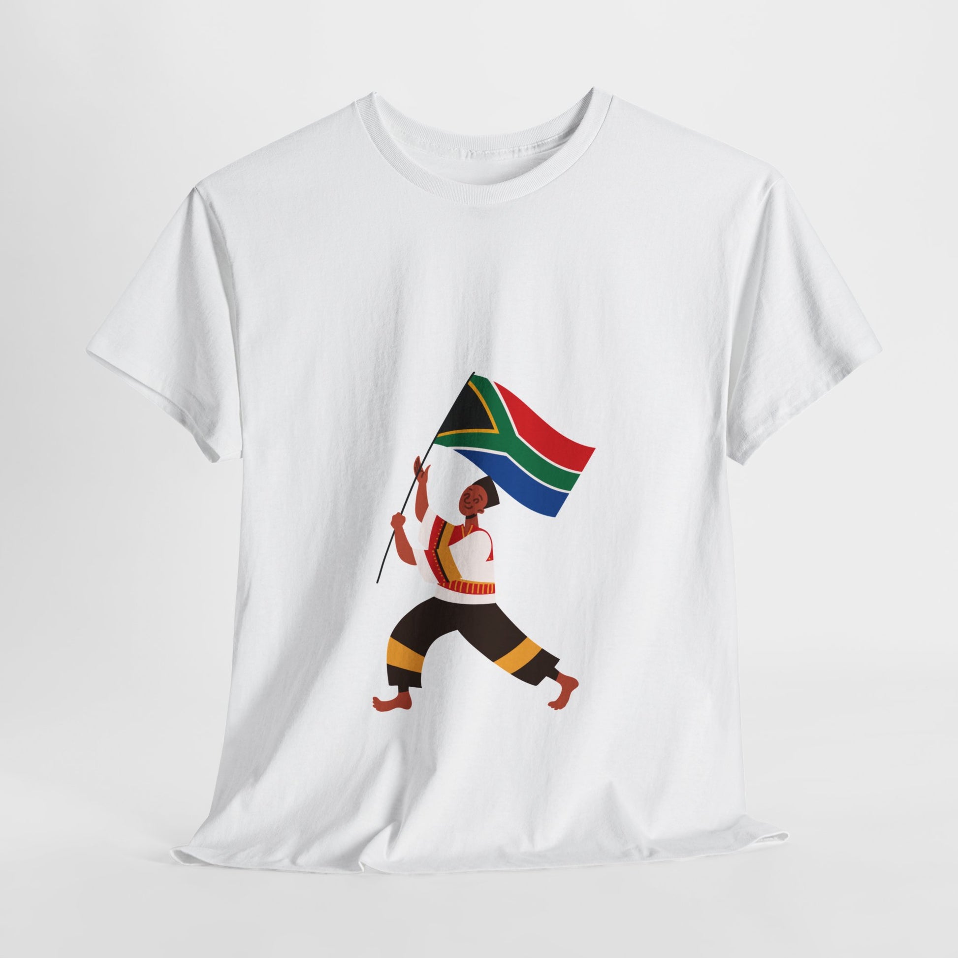 This classic fit tee features a dynamic image printed right on the front. It showcases a person proudly waving the South African flag, a symbol of unity and national pride. The bold design is sure to spark conversation and show your love for your country.